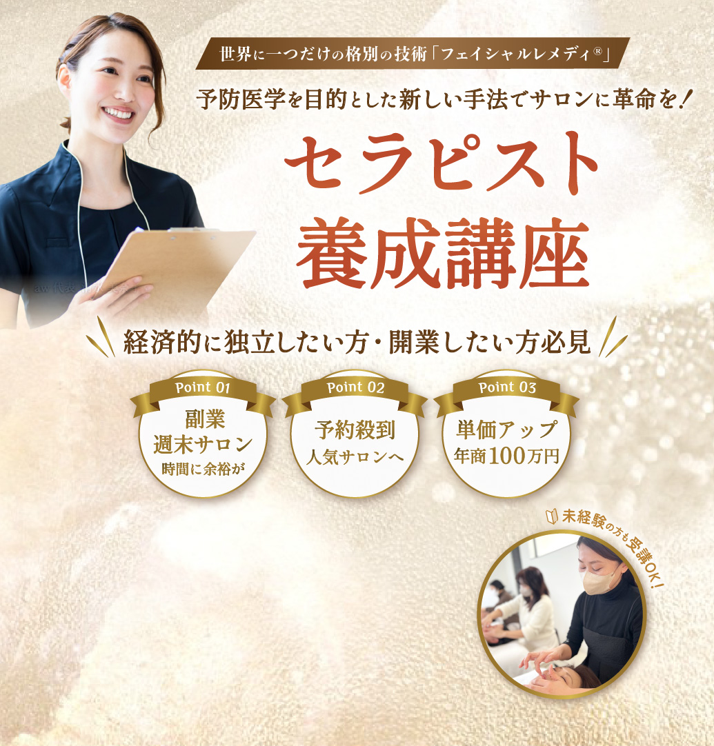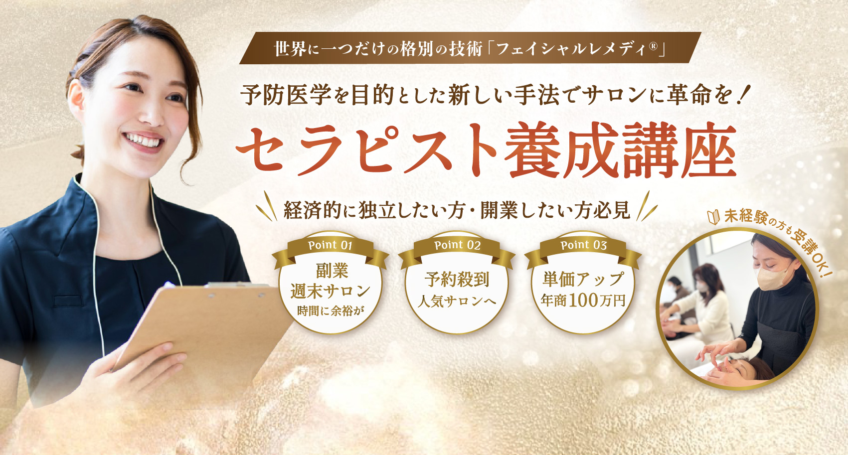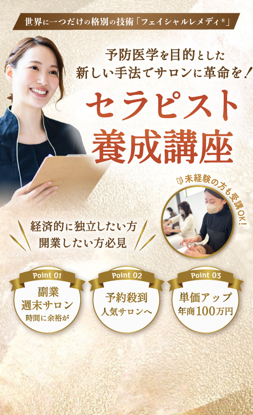 2020年から東京・大阪・神戸・富山で開催しているフェイシャルレメディスクールでは、この素晴らしい技術を学ぶことはもちろんですが、個人サロンの経営の仕方、個人サロンならではのビジネス戦略を一から学べることも大きな特徴です。大手サロンと同じことをしていては成功できない。個人サロンには個人サロンのやり方があることを、エステの仕事が大好きな方にこそ、知っていただきたいのです。